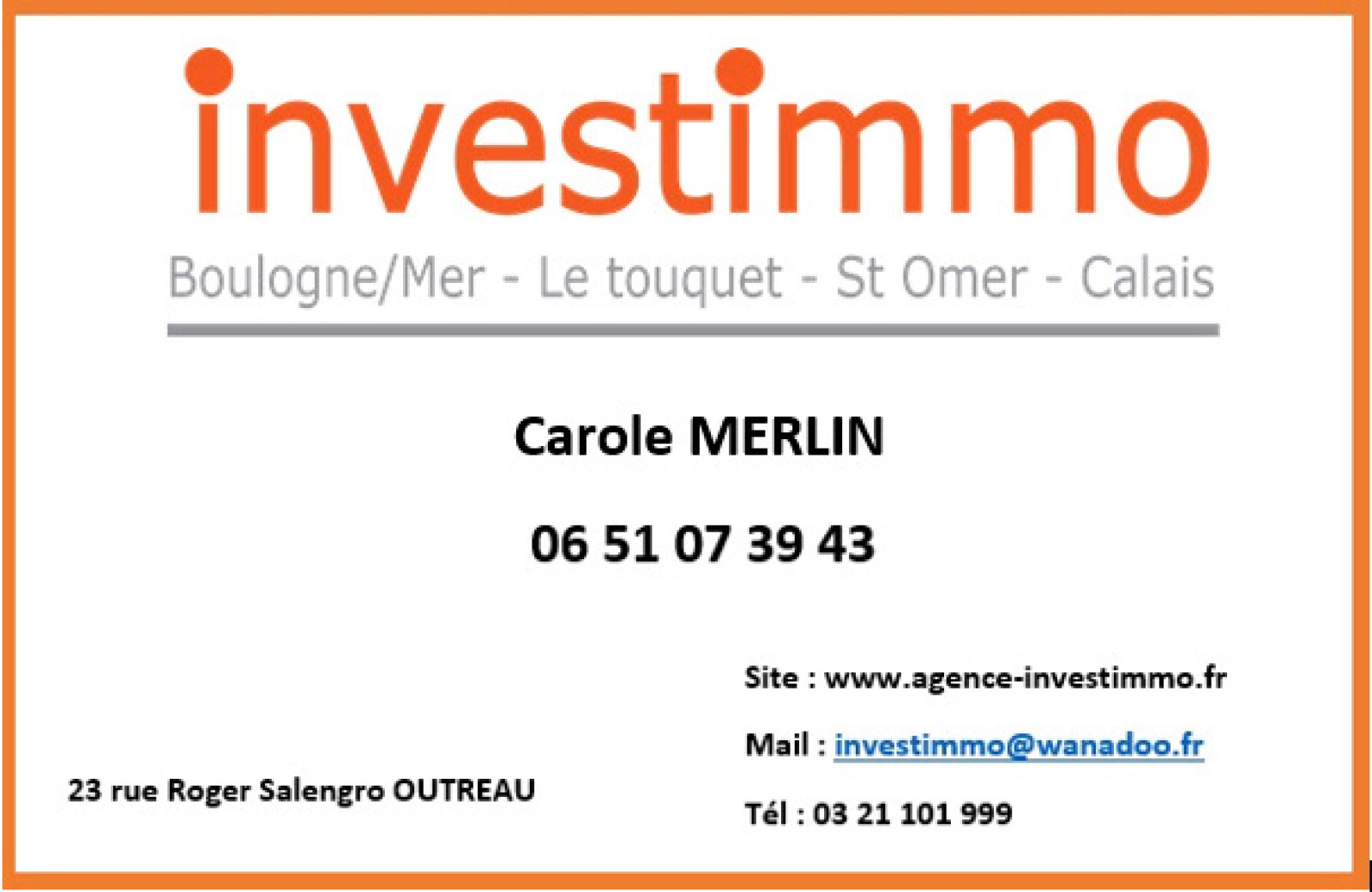 Pour plus de renseignements contactez Carole Merlin au O6.51.O7.39.43 ou à l'agence Investimmo au O3.21.1O1.999
